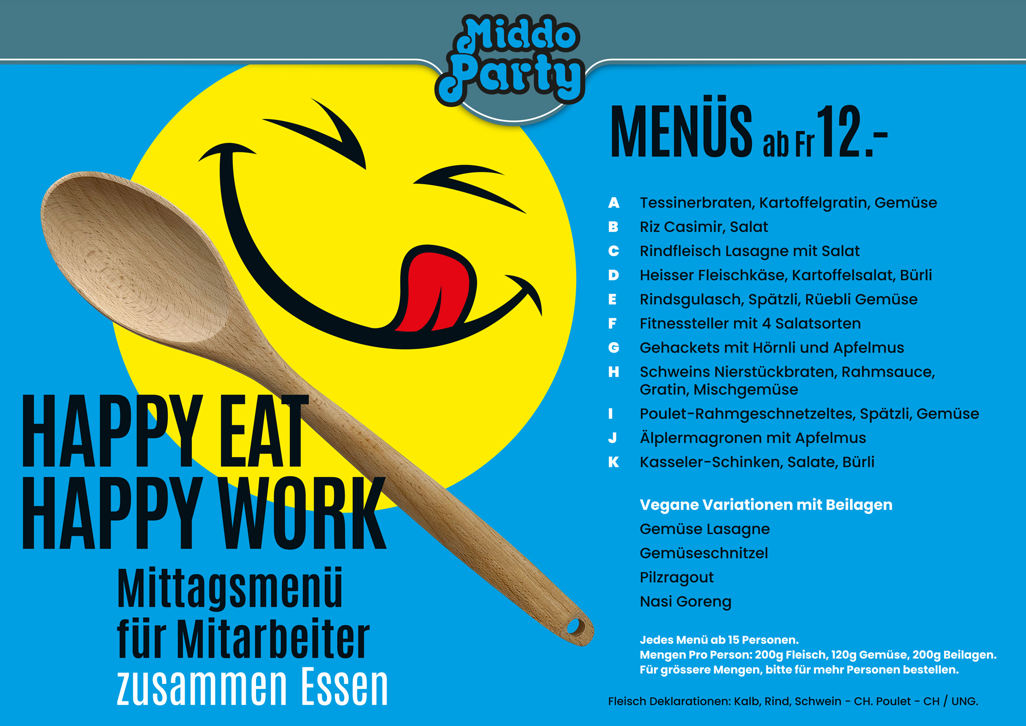 Middo Party bietet Unternehmen die perfekte Lösung für gemeinsame Mittagessen. Mit einer Vielfalt an köstlichen Menüs ab CHF 12.- können Mitarbeiter aus leckeren Optionen wie Tessinerbraten, Riz Casimir, Rindfleisch Lasagne und vielen weiteren wählen. Auch vegane Alternativen wie Gemüse Lasagne und Nasi Goreng sind erhältlich.